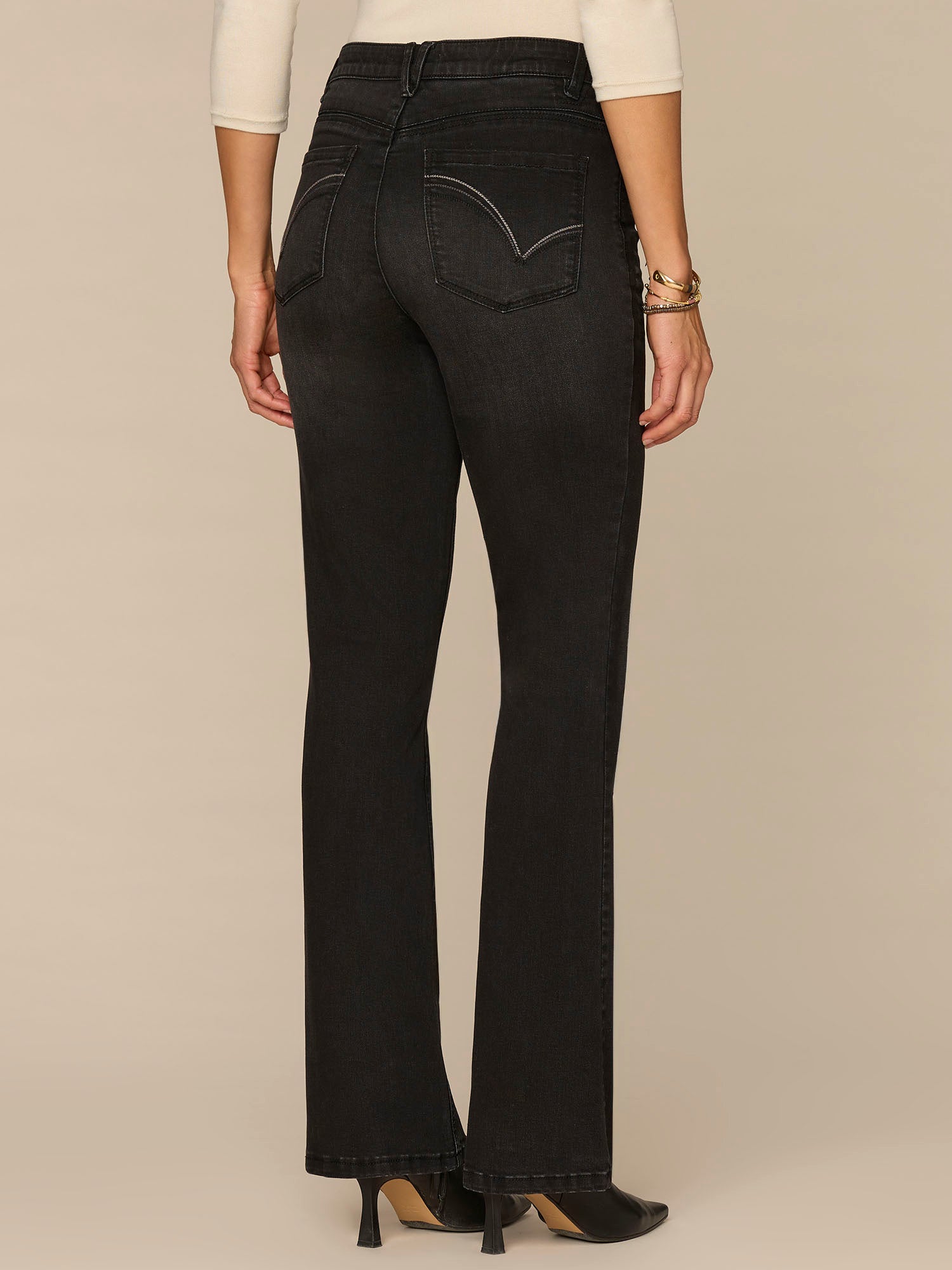 These washed black Itty Bitty Bootcut jeans are fitted from the hips to calves, with a baby bootcut leg opening that creates a lengthening effect. Designed with embroidered cascading “D” back pockets and engineered with ‘Ab’solution® fit technology to smooth, support, and enhance your shape.