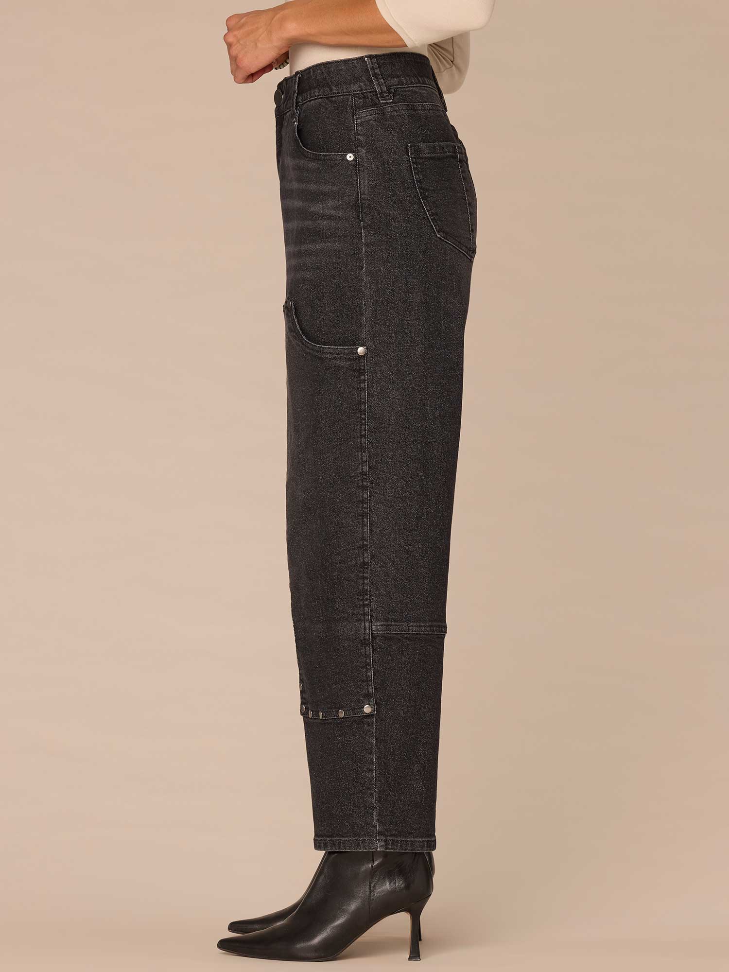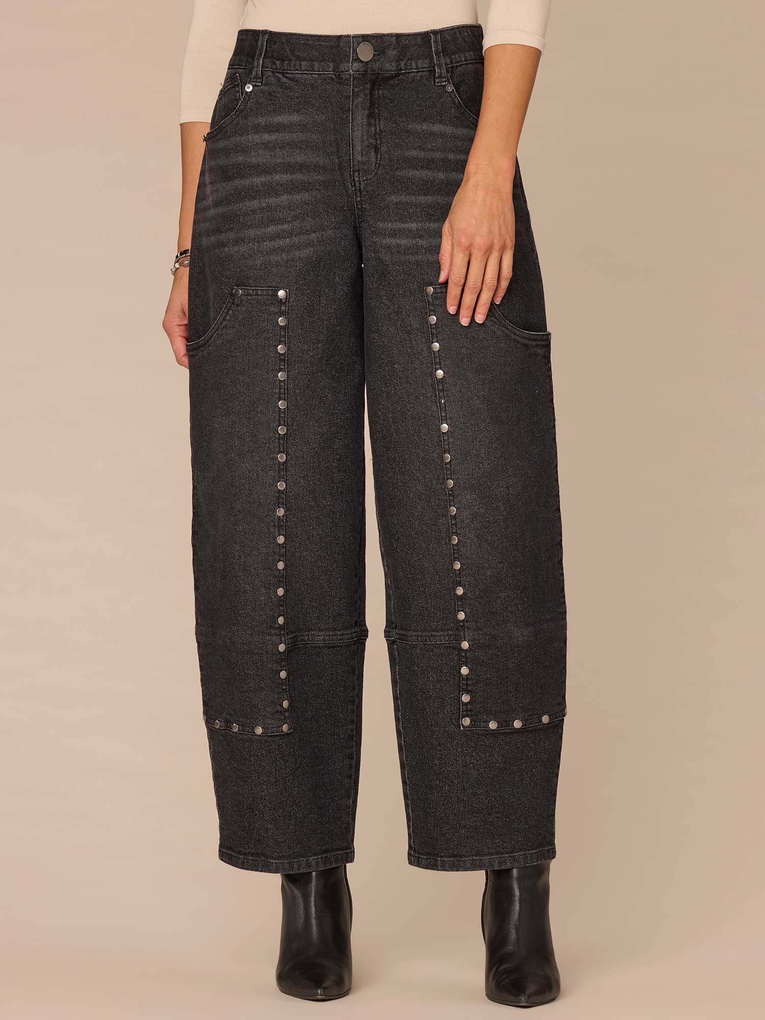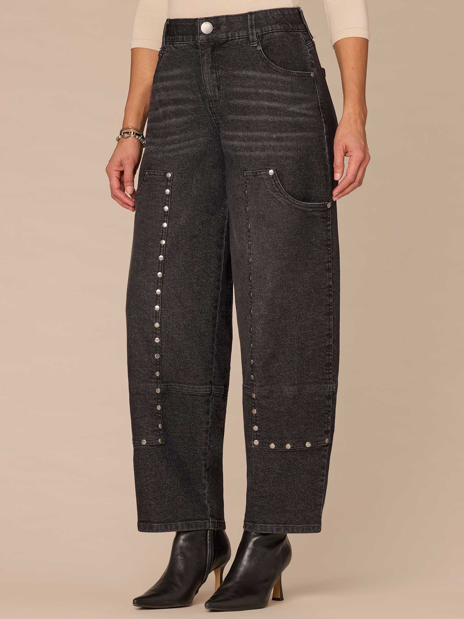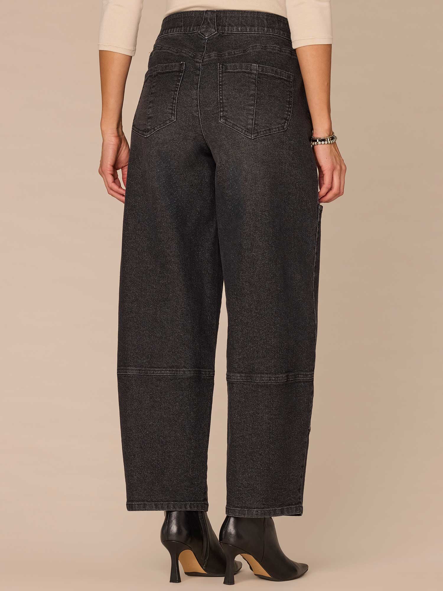 The relaxed Barrel Leg is slightly fitted at the hips, with a looser, relaxed fit from the thighs to the hemline. Designed with studded panels, a black wash, and ‘Ab’solution® fit technology to smooth, support, and enhance your shape—giving you everything from a flatter tummy to a perkier rear view.