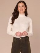 Elevate your sweater game with this pointelle style. It’s designed with long sleeves, a mock neck with beaded ruffle edge detailing, and a fit that looks great tucked in.