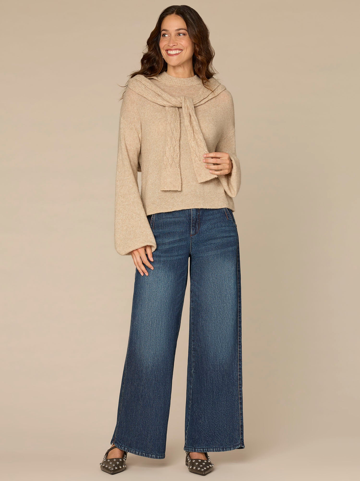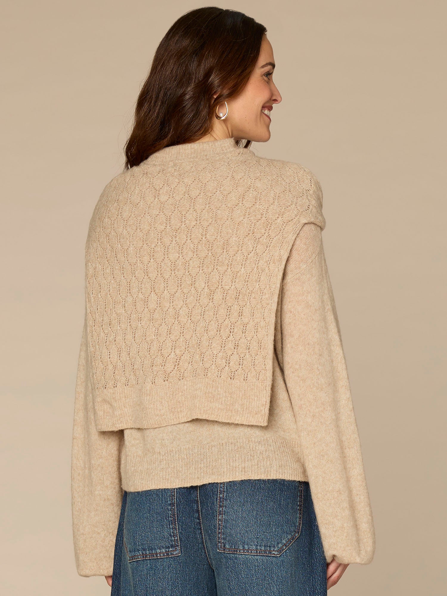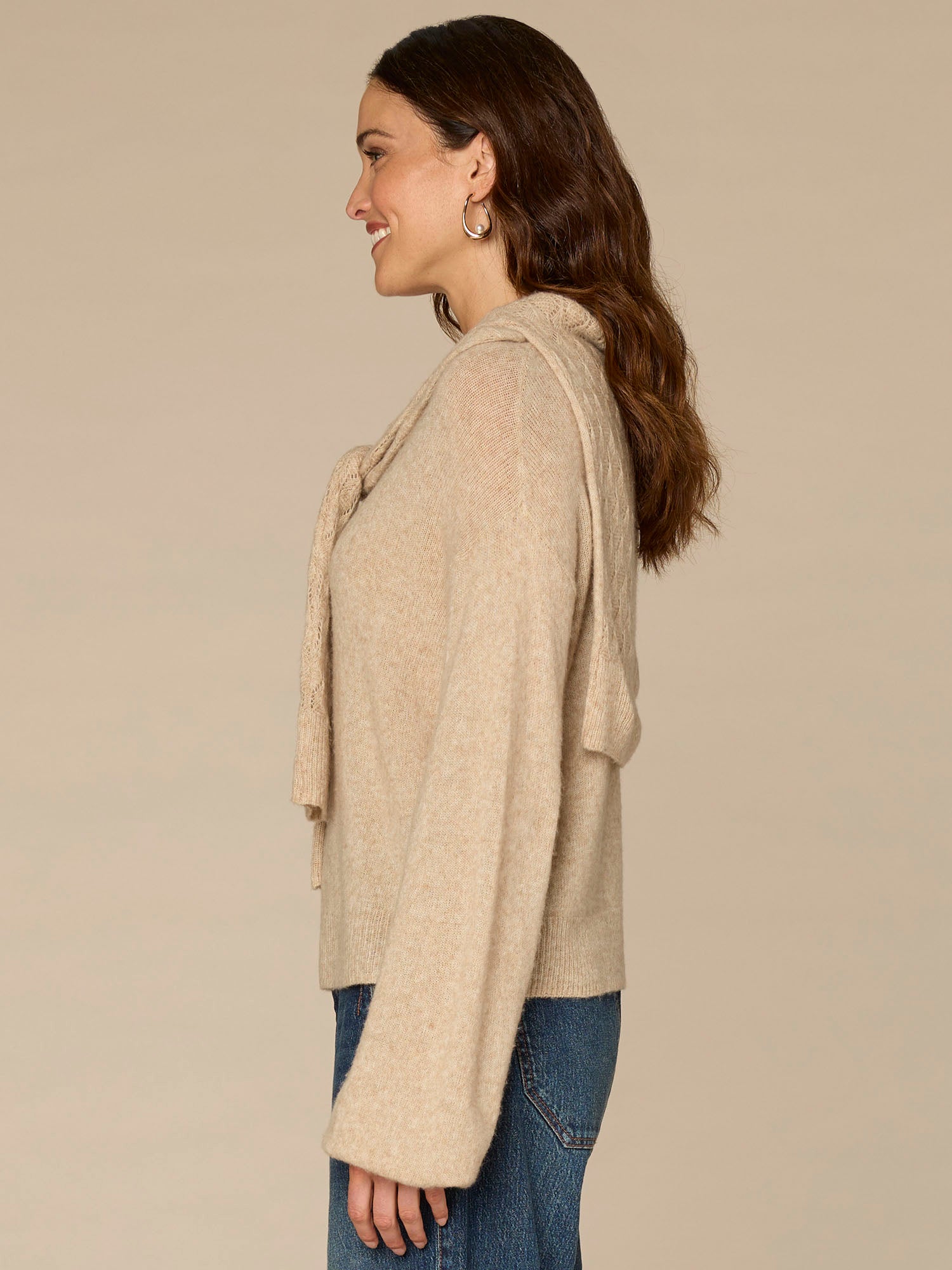 With long sleeves, a round neck, and a straight hem, this pointelle sweater is a must-have style. It leans into the twofer trend with a sweater tie front that creates a layered look.