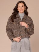 Finally, a jacket that goes with everything. This cropped woven style has long sleeves, a collared neck, zip front, patch pockets, and a fray hem, perfect for dressing up or down.